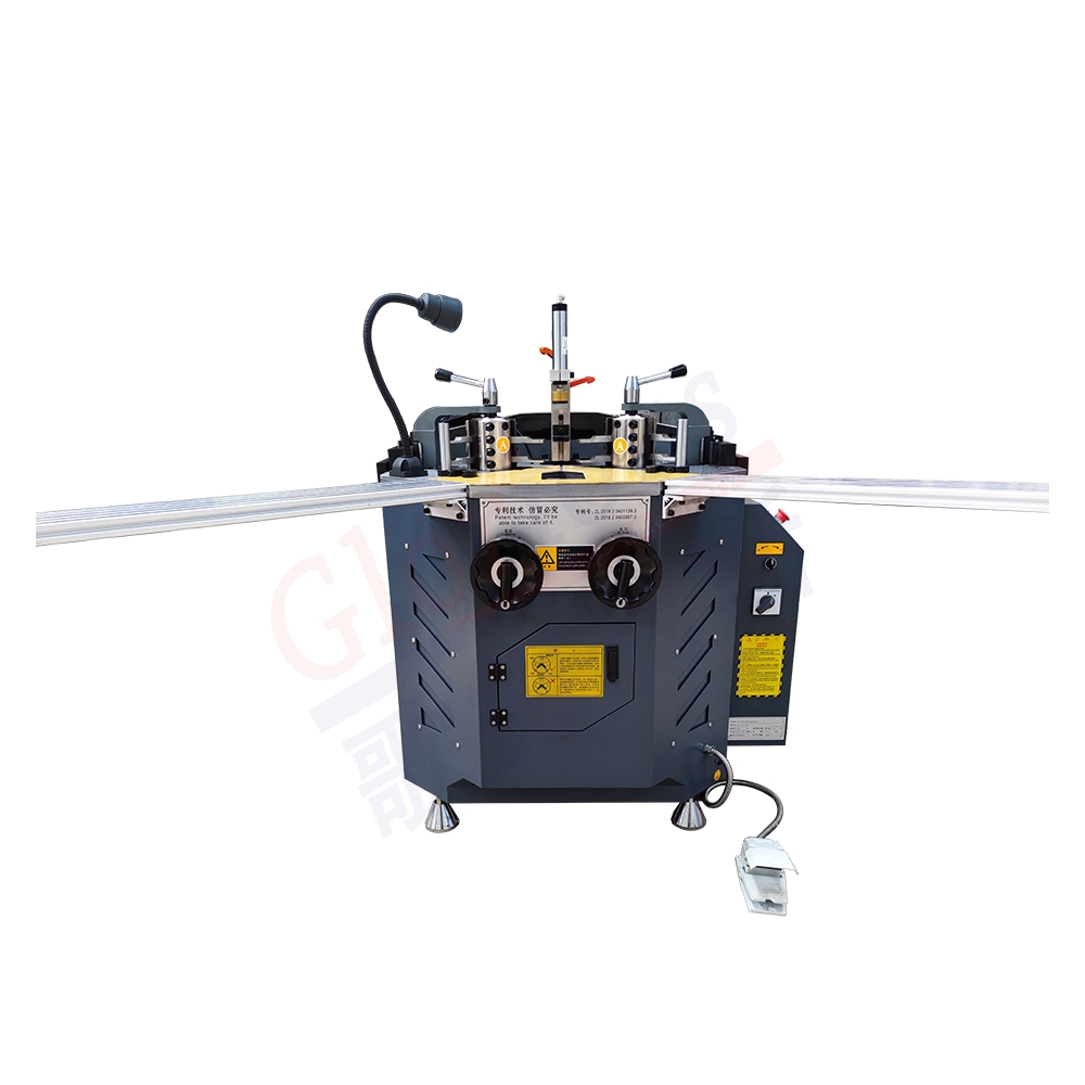 該組角機是高檔鋁門窗生產專用設備,適用于角碼結構型鋁門窗90度角聯接。安裝三套型材加工刀具,減少換刀時間,增加工作效率,常用刀具可長期固定使用。